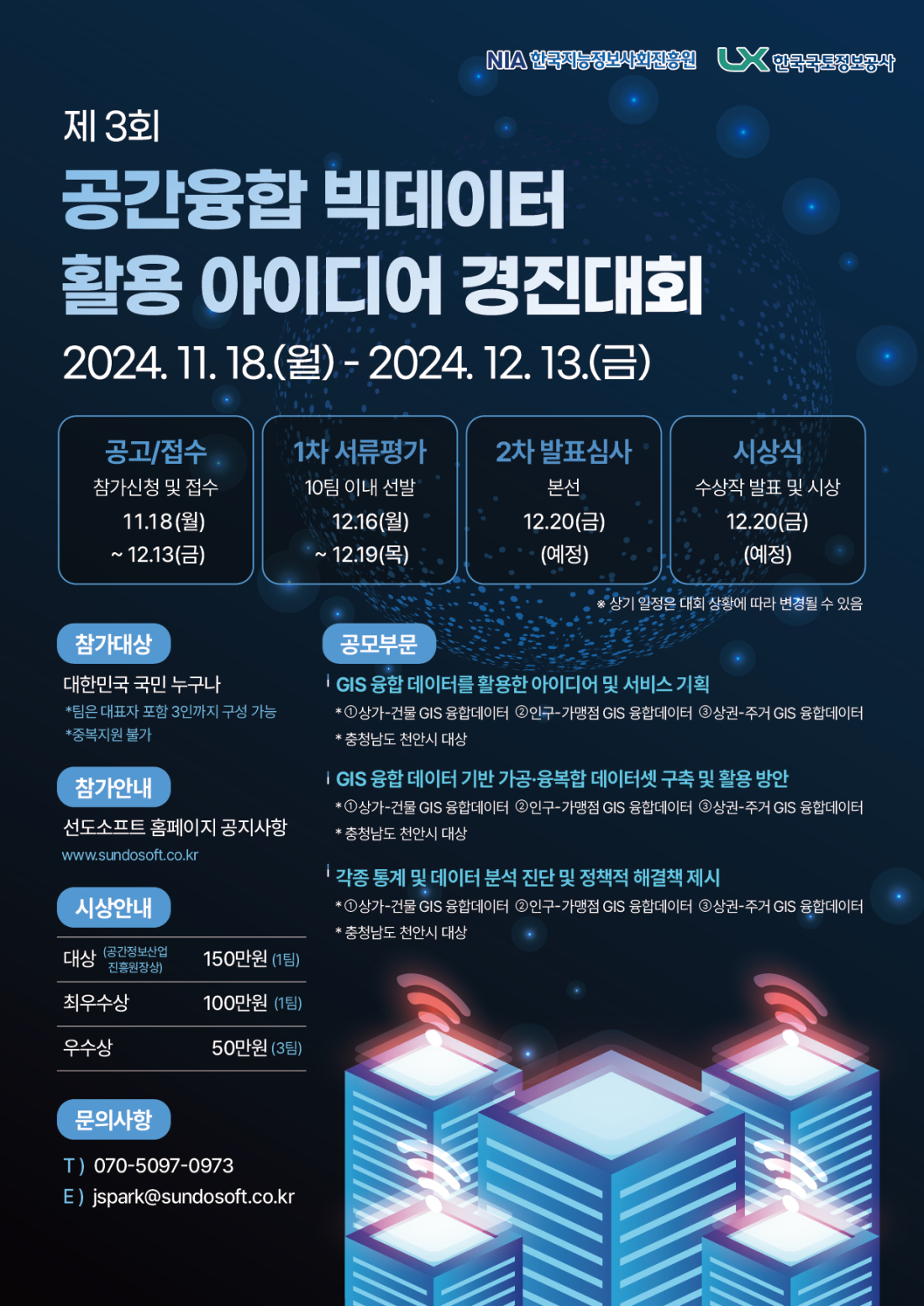지앤티솔루션과 선도소프트에서 빅데이터의 활용성 확대 및 공간융합 빅 데이터 플랫폼 활성화를 위해 「2024 공간융합 빅데이터 활용 아이디어 경진 대회」를 개최하오니, 학생들에게 홍보하여 주시기 바랍니다.