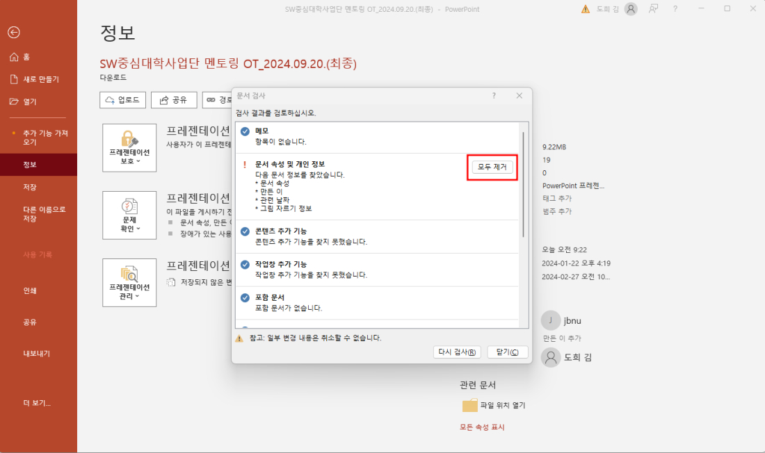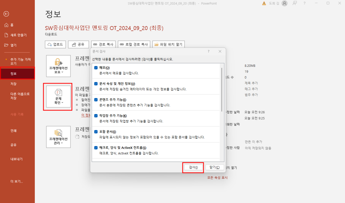 1) PPT 파일열기 > [파일] > [정보] > "프레젠테이션검사 (문제확인)" > 문서검사 > 검사