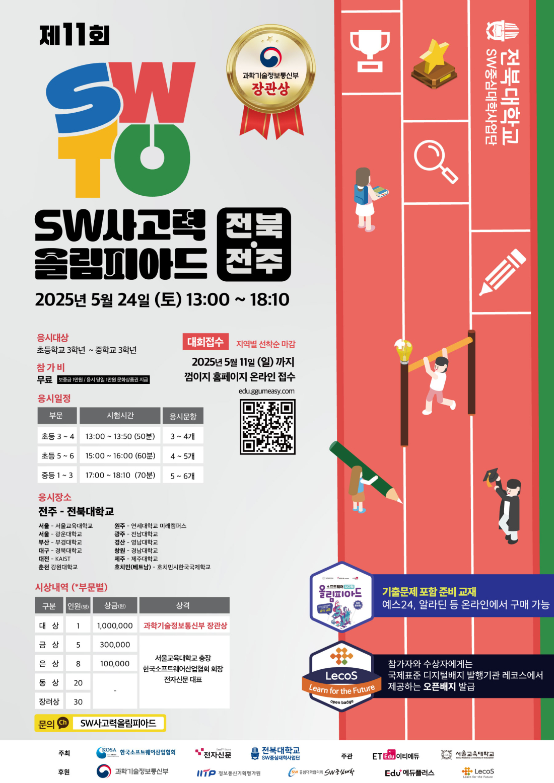 전북 제11회 소프트웨어사고력올림피아드(SWTO)는 지난해에 이어 지역 거점 국립대인 전북대에서 열린다. 지난 10회 대회부터 전주에 위치한 전북대가 SWTO 개최대학으로 참가해, 전북 지역 학생들이 보다 편리하게 SWTO에 참여할 수 있게 됐다. 전북 인근의 충남·전남 학생도 참여한다.