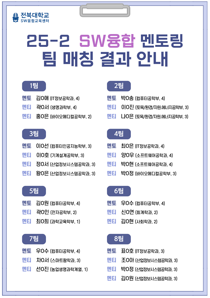 2025학년도 2학기 SW융합 멘토링 프로그램 팀 매칭 결과 안내 드립니다.