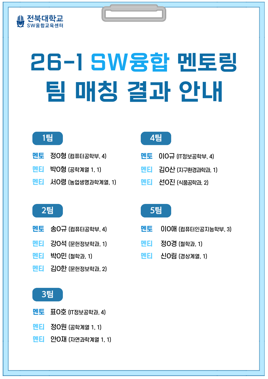 2026학년도 1학기 SW융합 멘토링 프로그램 팀 매칭 결과 안내 드립니다.