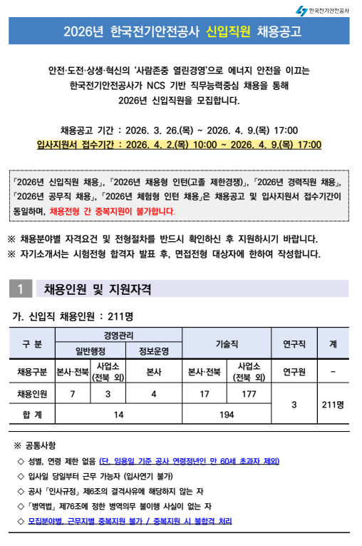 2026년 한국전기안전공사 신입직원을 채용합니다.